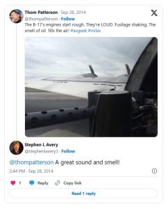 As the plane’s four propeller engines sputter to life, I’m tweeting (with misspelled words) about how LOUD they are and how they’re spewing the smell of oil. “A great sound and smell,” Stephen L Avery tweets back.