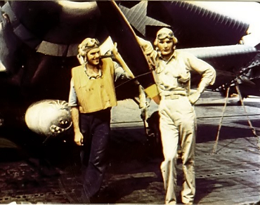 It was quick work to figure the return course, and as I raised my head from the plotting board, a stream of tracer bullets started chopping the water around the plane. Almost immediately my gunner, W. G. Chochalousek, in the rear seat, opened fire. Then a Jap Zero zoomed out of range ahead of me. A hurried glance around found another Zero about 1000 feet above, to the left and astern, about to make another attack. Remaining at 20 feet above the water, I waited until the attacking plane was well in his dive, then wrapped my plane in a steep turn toward him. This not only gave him a more difficult deflection shot, but also enabled my gunner to have free room to maneuver his guns. Then ensued about a 5-minute chase, first one Zero attacking from the right, then the second from the left. Each time I would wrap up toward the attacker with Chochalousek keeping up a constant fire. Suddenly a burst from a Jap seemed to envelop the whole plane. The left side of my cockpit was shattered, and I felt my left shoulder had been hit with a sledgehammer. Naturally enough it seemed like the end, we sure were goners. After two or three seconds, I realized there was an unusual quietness except for the purring engine of the old Dauntless. Grasping the intercom phone, I yelled to Chochalousek, but no answer. It was difficult to turn with the pain in my left shoulder and arm, but I finally managed and there was the gunner. facing aft, guns at the ready and unharmed. He had shot down one of the Zeros (probably the one that had got the big burst in on us) and the other decided to call it quits.