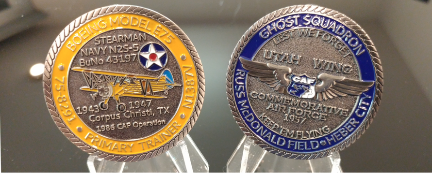 The challenge coin featuring the Stearman 75-8291 displays details of significance not only of this specific Stearman, but also of the Commemorative Air Force Utah Wing. Carry or display it as a token of more than 75 years of flying history and the starting point of U.S. military pilots that went on to shape the history of the world.